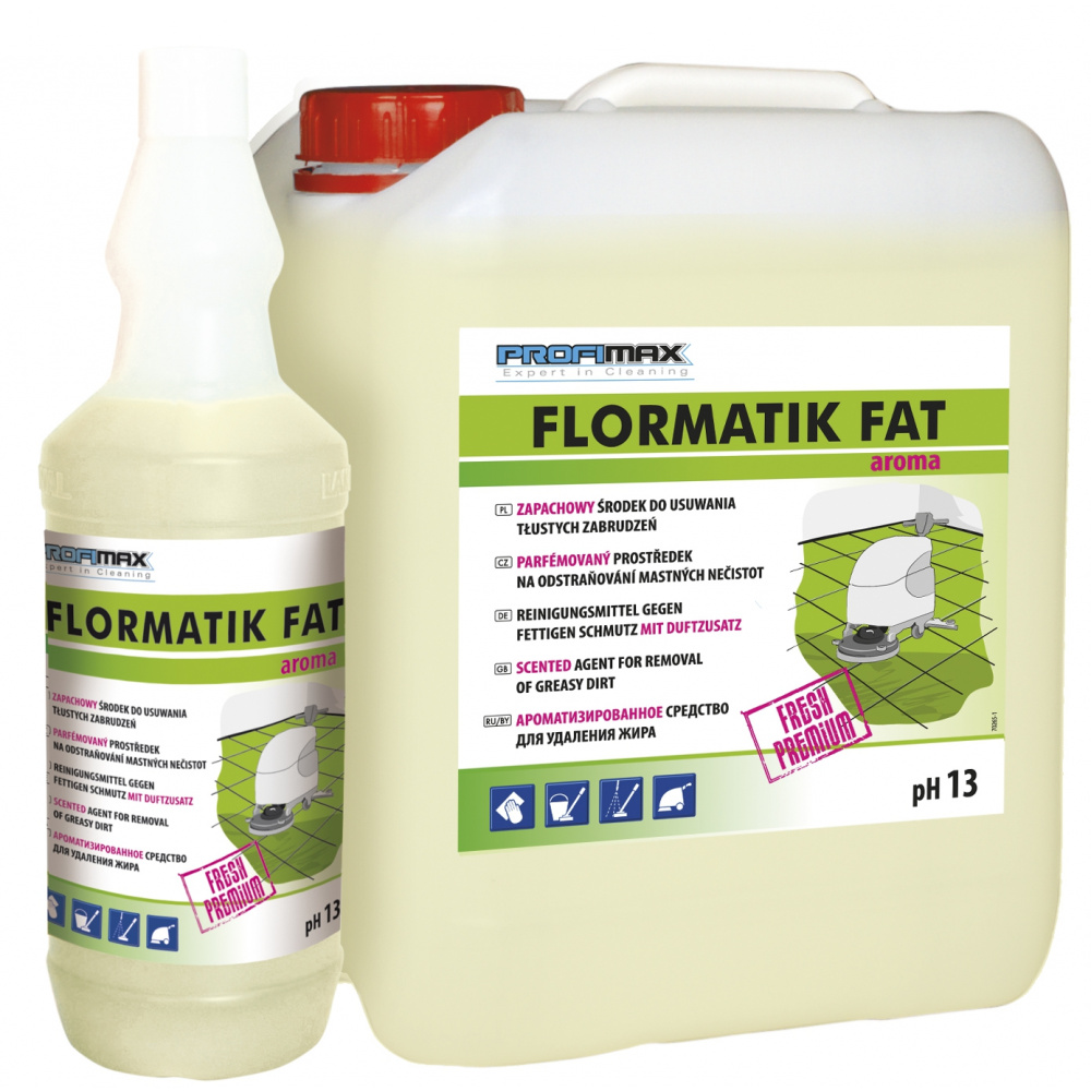 Vysoce účinný čistící prostředek do průmyslového prostředí (strojírenské výrobní haly a dílny). Chemie je vhodná pro použití do mycích automatů i pro ruční mytí. FLOORMATIC FAT AROMA je směs alkalických kovů a povrchově aktivní látky s velkou silou čištění, tak aby rychle a účinně odstranila nečistoty, například: mastné oleje a maziva, gumové stopy vozíků od pneumatik z vodě odolných povrchů, jako jsou betonové podlahy, PVC, kámen přírodní a umělé stěny, části strojů a motorů. Používá se také pro praní oděvů. Na dlouhou dobu zanechává příjemnou vůni v celém objektu čištění.