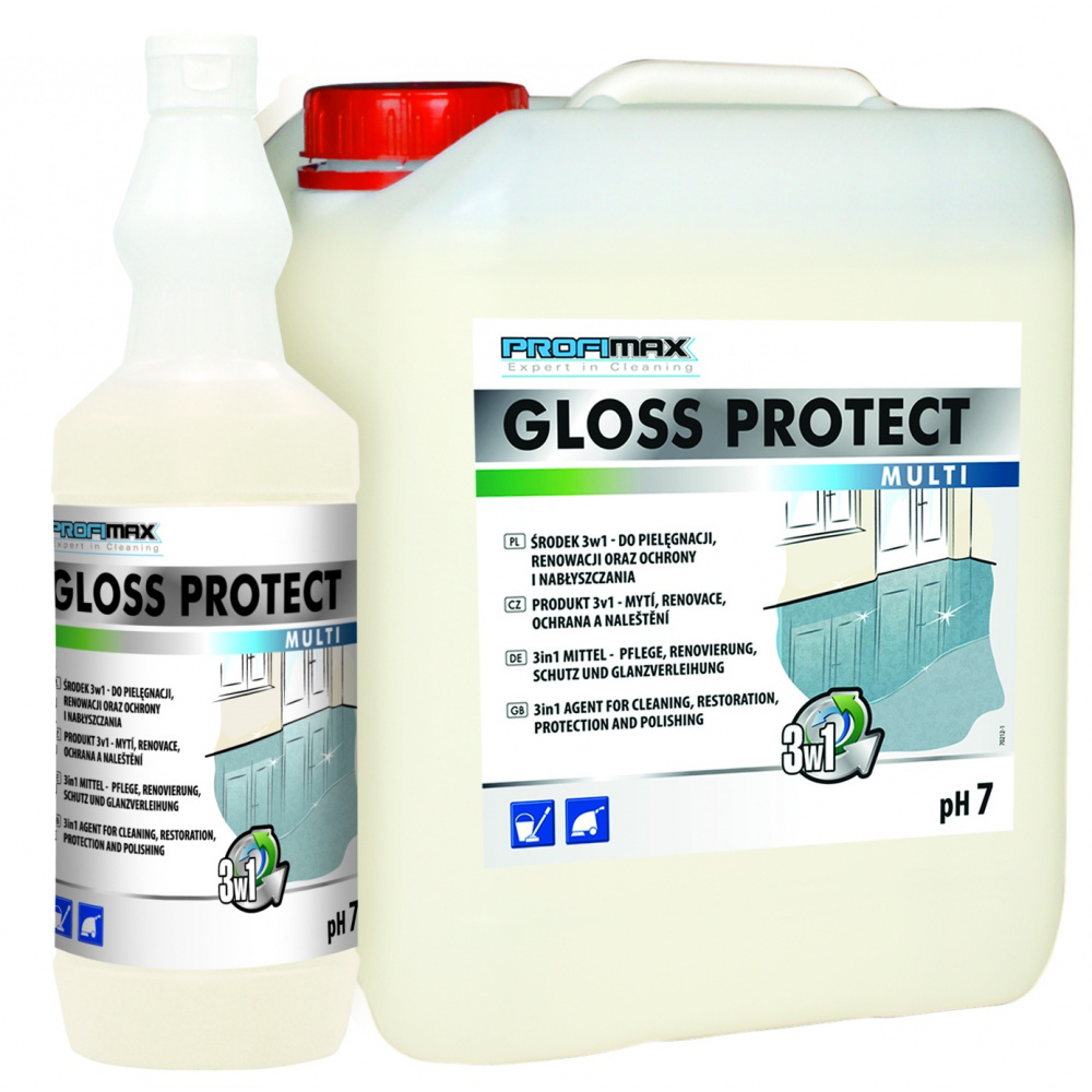 Prostředek 3 v 1 pro trvalé uchování lesku podlahy, regenerace, důkladné odmytí. Vhodné pro všechny vodotěsné podlahy (např. PVC, linoleum, přírodní a umělý kámen). Polymery obsažené v GLOSS PROTECT MULTI vytvoří ochranný film, chránící čištěný povrch před vniknutím nečistot. Splňuje požadavky na odolnost proti uklouznutí.