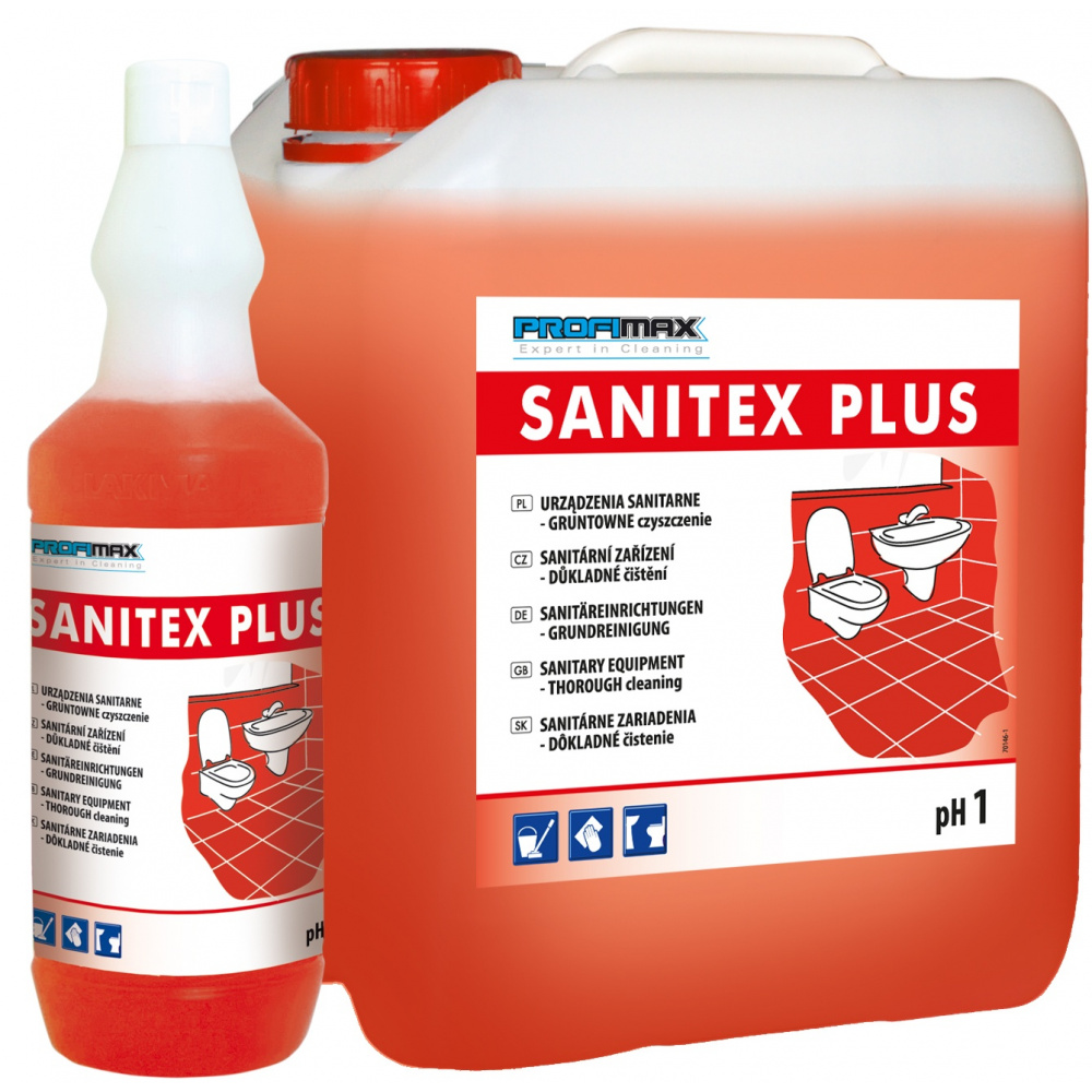 SANITEX PLUS - prostředek na sanitární zařízení - generální úklid- . Rychle působící prostředek pro každodenní péči. SANITEX PLUS je silnější koncentrát než SANITEX V a je vhodný například pro čištění pisoárů, bidetů, dřezů s porcelánu, keramiky a nerezové oceli. Účinně odstraňuje vodního kamene, vápenaté usazeniny, rez, mastnoty a zbytky mýdla.