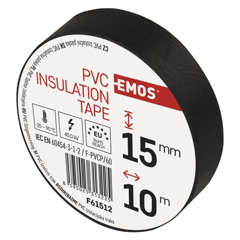 barva: černá|délka návinu: 10 m|doporučená skladovací teplota: 10–45 °C|elektrická pevnost minimálně: 40 kV/mm|elektrická pevnost po vlhku minimálně: 35 kV/mm|integrovaná textilní síťka: ne|materiál lepidla: kaučuk|odolné UV: ano|pevnost v tahu: 150 N/10 mm|potisk: bez potisku|předpokládané použití: izolace kabelů|přilnavost k oceli minimálně: 1,8 N/10 mm|přilnavost k podkladu: 1,5 N/10 mm|prodejní obal: 10 ks, fólie|prodloužení minimálně: 125 %|rozměr: 60 × 15 mm|rozsah instalačních teplot: -25–90 °C|samozhášivé: ne|šířka pásky: 15 mm|splňuje směrnici REACH: ano|splňuje směrnici ROHS: ano|tloušťka pásky: 0,13 mm|typ pásky: PVC|vodotěsný spoj: ano|vyhovuje normě: ČSN EN 60454-3-1-2/F-PVC/60|vytváří tlakotěsný spoj: ne|zkouška plamenem: <1 sec