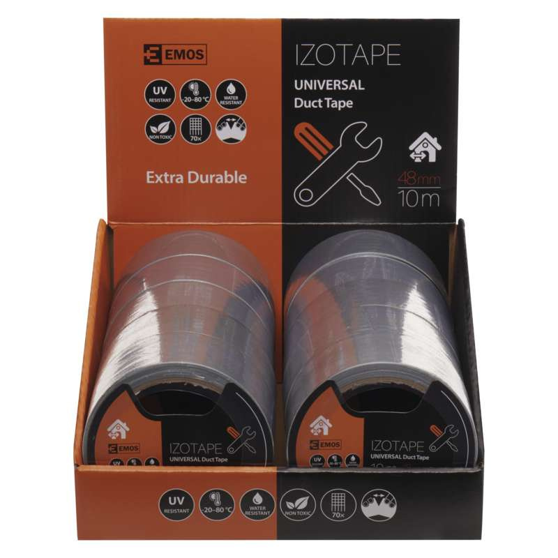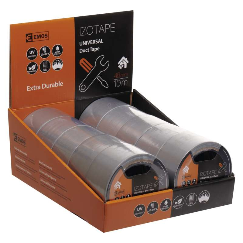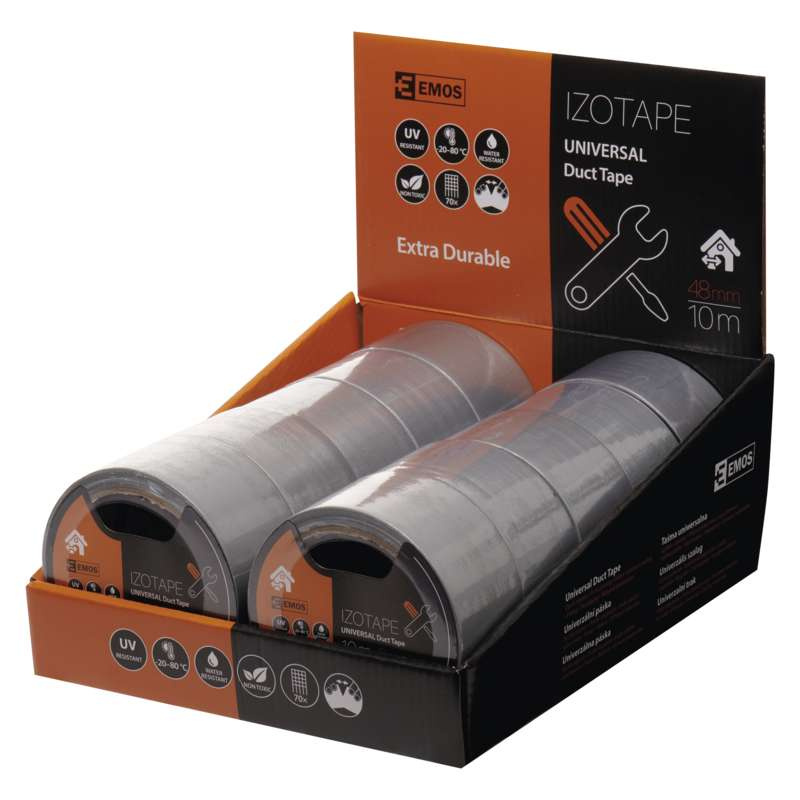 barva: stříbrná|délka návinu: 10 m|doporučená skladovací teplota: -20 °C až +80 °C|elektrická pevnost minimálně: neuvádí se|elektrická pevnost po vlhku minimálně: neuvádí se|integrovaná textilní síťka: 70 vláken|materiál lepidla: syntetický kaučuk|odolné UV: ano|pevnost v tahu: neuvádí se|potisk: bez potisku|předpokládané použití: hobby, dílna, zahrada|přilnavost k oceli minimálně: neuvádí se|přilnavost k podkladu: neuvádí se|prodejní obal: 10 ks, display box|prodloužení minimálně: neuvádí se|rozměr: 105 × 48 mm|rozsah instalačních teplot: 5–80 °C|samozhášivé: ne|šířka pásky: 48 mm|splňuje směrnici REACH: neuvádí se|splňuje směrnici ROHS: neuvádí se|tloušťka pásky: 0,21 mm|typ pásky: univerzální samolepící páska DUCT TAPE|vodotěsný spoj: neuvádí se|vyhovuje normě: neuvádí se|vytváří tlakotěsný spoj: ne|zkouška plamenem: neuvádí se