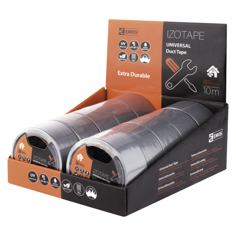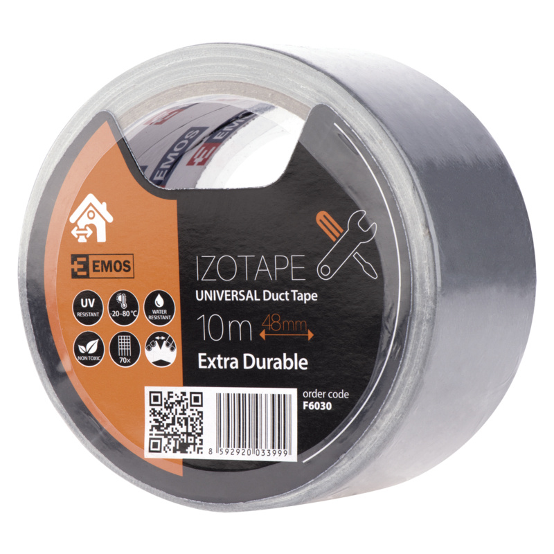 Vodotěsná univerzální páska typu DUCT TAPE s polyetylenové fólie na textilním nosiči s lepidlem na bázi přírodního kaučuku. Páska se vyznačuje vysokou pevností v tahu, extrémní přilnavostí a lepivostí k různým povrchům a vynikající odolností vůči povětrnostním vlivům. Je velmi vhodná k opravám prasklých zahradních hadic, k uzavírání polykarbonátových desek ( bazény, přístřešky ) i k fixaci a bandážování. Je výbornou volbou pro dočasné opravy, utěsnění, přidržení a značení. Technické parametry