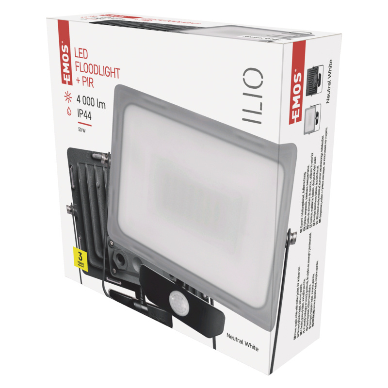 akumulátor: neuvádí se|barva: černá|barva světla: neutrální bílá|délka přívodního kabelu: neuvádí se|doba svícení na AKU: neuvádí se|dosah PIR senzoru: 10 m|energetická třída (od 1.9.2021): neuvádí se|frekvence: 50/60 Hz|index podání barev (CRI): Ra > 80|krytí: IP44|materiál difuzoru: plast (PC)|materiál přívodního kabelu: neuvádí se|materiál těla: hliník|náhrada za žárovku: 430 W|napětí: 220–240 V~|PIR senzor: ano|počet průchozích zásuvek: 0|příkon: 50 W|prodejní obal: 1 ks, krabice|proud: 220 mA|řada: ILIO|rozměr: 208 × 209 × 75 mm|rozsah pracovní teploty: -20 °C až +40 °C|stupeň ochrany proti mechanickým nárazům: IK06|světelný tok: 4 000 lm|teplota chromatičnosti: 4 000 K|typ přívodního kabelu: neuvádí se|typ průchozích zásuvek: neuvádí se|účiník: > 0,9|úhel vyzařování: 120°|záruční doba: 3 roky|zdroj světla: LED|životnost: 25 000 hodin|zkušební žárovka součástí balení: ne