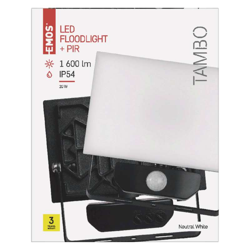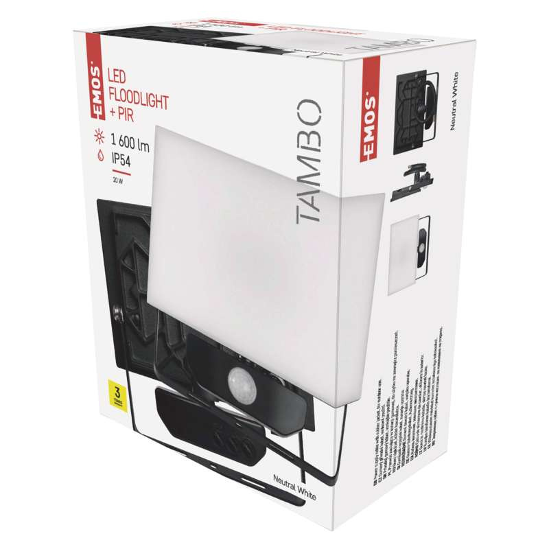 akumulátor: neuvádí se|barva: černá|barva světla: neutrální bílá|délka přívodního kabelu: 30 cm|doba svícení na AKU: neuvádí se|dosah PIR senzoru: 10 m|energetická třída (od 1.9.2021): neuvádí se|frekvence: 50/60 Hz|index podání barev (CRI): Ra > 80|krytí: IP54|materiál difuzoru: plast (PC)|materiál přívodního kabelu: guma|materiál těla: hliník|náhrada za žárovku: 170 W|napětí: 220–240 V~|PIR senzor: ano|počet průchozích zásuvek: 0|příkon: 20 W|prodejní obal: 1 ks, krabice|proud: 90 mA|řada: TAMBO|rozměr: 135 × 165 × 64 mm|rozsah pracovní teploty: -20 °C až +40 °C|stupeň ochrany proti mechanickým nárazům: IK06|světelný tok: 1 600 lm|teplota chromatičnosti: 4 000 K|typ přívodního kabelu: neuvádí se|typ průchozích zásuvek: neuvádí se|účiník: > 0,9|úhel vyzařování: 120°|záruční doba: 3 roky|zdroj světla: LED|životnost: 25 000 hodin|zkušební žárovka součástí balení: ne