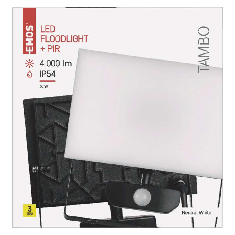 akumulátor: neuvádí se|barva: černá|barva světla: neutrální bílá|délka přívodního kabelu: 30 cm|doba svícení na AKU: neuvádí se|dosah PIR senzoru: 10 m|energetická třída (od 1.9.2021): neuvádí se|frekvence: 50/60 Hz|index podání barev (CRI): Ra > 80|krytí: IP54|materiál difuzoru: plast (PC)|materiál přívodního kabelu: guma|materiál těla: hliník|náhrada za žárovku: 430 W|napětí: 220–240 V~|PIR senzor: ano|počet průchozích zásuvek: 0|příkon: 50 W|prodejní obal: 1 ks, krabice|proud: 220 mA|řada: TAMBO|rozměr: 210 × 217 × 64 mm|rozsah pracovní teploty: -20 °C až +40 °C|stupeň ochrany proti mechanickým nárazům: IK06|světelný tok: 4 000 lm|teplota chromatičnosti: 4 000 K|typ přívodního kabelu: neuvádí se|typ průchozích zásuvek: neuvádí se|účiník: > 0,9|úhel vyzařování: 120°|záruční doba: 3 roky|zdroj světla: LED|životnost: 25 000 hodin|zkušební žárovka součástí balení: ne