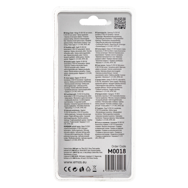 bezkontaktní měření: polarita zdrojů, zkratu, vyzařování mikrovlnných trub, monitorů|frekvenční rozsah: 0–60 Hz|měření spojitosti obvodů: ne|napájení: 2× 1,5 V LR41 (součástí balení)|nastavení dvou citlivostí: ne|prodejní obal: 1 ks, blistr|signalizace: optická|stejnosměrné a střídavé napětí: 0–250 V, 70–250 V|stejnosměrné napětí: 0 až 250 V bezkontaktně|střídavé napětí: 70 až 250 V bezkontaktně|určení fáze a sledu: ne|určení polarity: ano