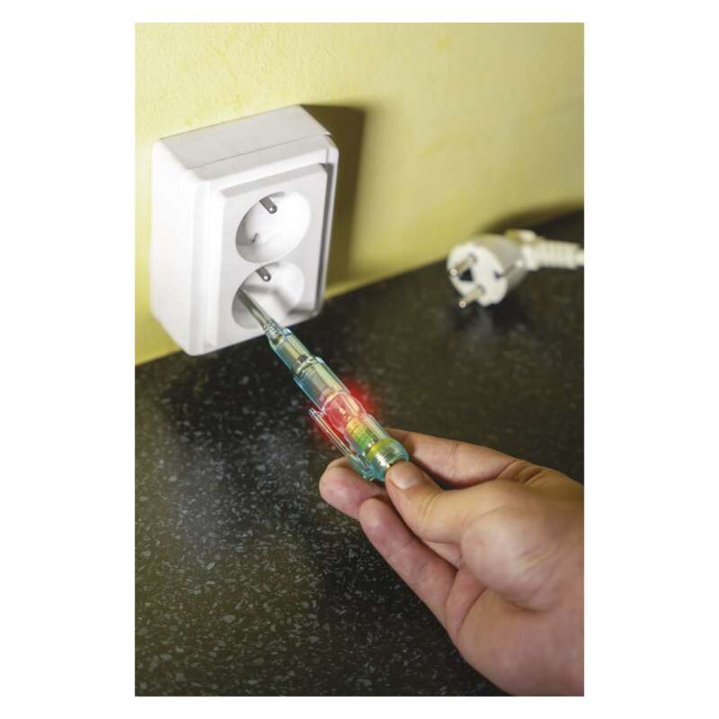 Zkoušečka napětí s optickou signalizací. Zkoušečka je určena ke zjišťování střídavého napětí 70–250 V a stejnosměrného napětí 0–250 V. Zkoušečka zjišťuje také polaritu zdrojů nebo zkrat. Zkoušečka napětí je napájena 2× LR41 (součást balení).Technické parametry