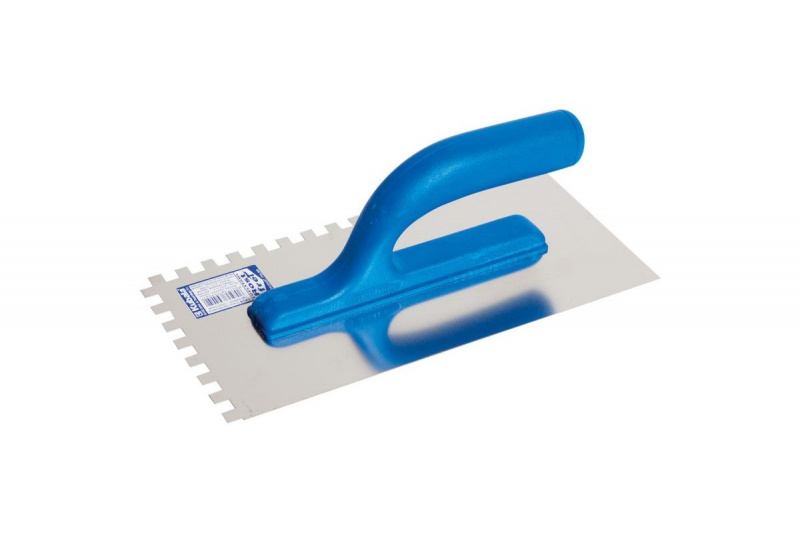 hladítko nerez zubové 270 x 130 mm plastová, ergonomická rukojeť: PS - polystyren nerezový, kyselině odolný plech tl. 0,7 mm slouží k nanášení lepidel pod obklady a dlažby, velikost zubů proporcionálně k velikosti obkladačekTechnické parametry