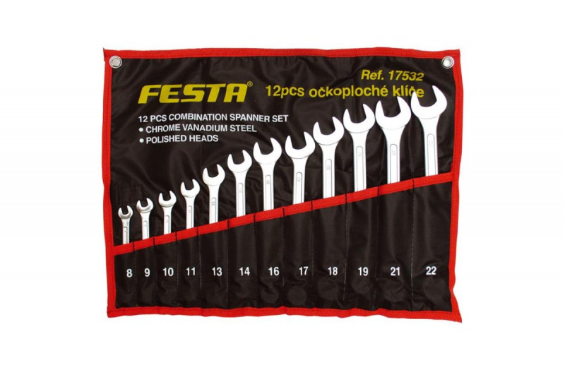 klíče očkoploché - sada 12ks vyrobeny kováním z vysoce kvalitní CrV oceli rozměry klíčů: 8; 9; 10; 11; 13; 14; 16; 17; 18; 19; 21; 22 mm sada je dodávána v pevném nylonovém pouzdře umožňujícím snadné skladování a manipulaci DIN 3113Technické parametry