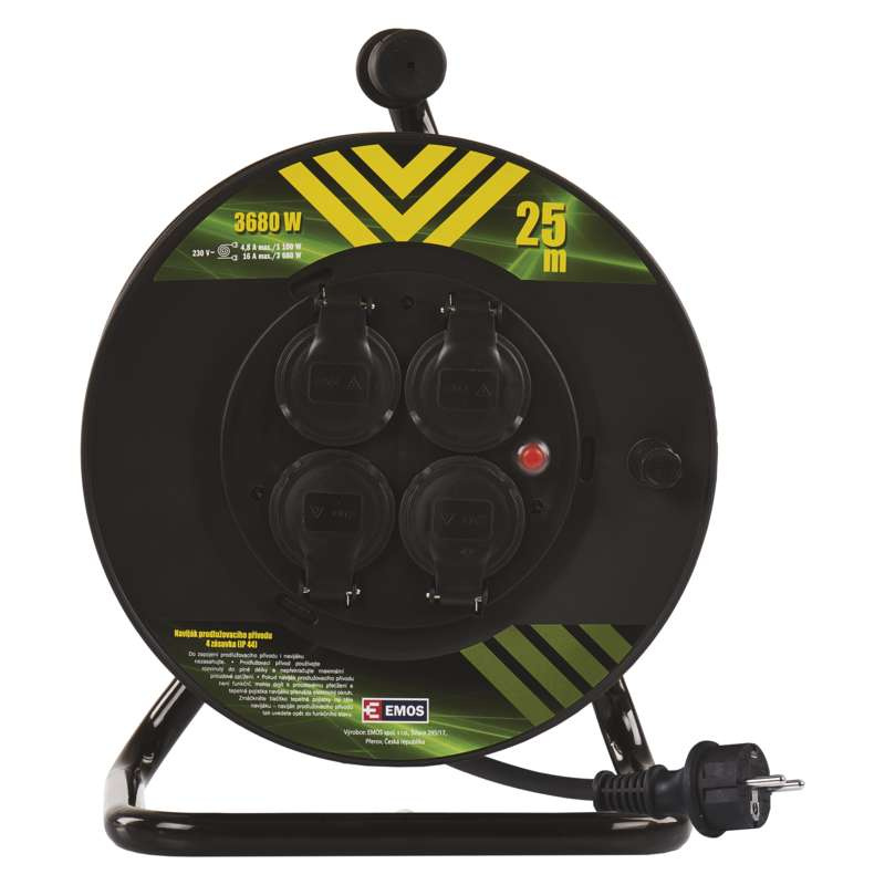 barva: neuvádí se|další funkce: ne|délka: 25 m|dětské clonky: ne|hmotnost: neuvádí se|krytí: IP44|max. zátěž: 3 680 W|napětí/proud: 230 V~|počet zásuvek: 4× 2P + PE|prodejní obal: 1 ks|produkt: buben s pohyblivým středem|průřez vodiče: 1,5 mm²|rozměr: neuvádí se|tepelná pojistka: ano|typ izolace: guma|vodič: H05RR-F3G|záruční doba: 2 roky|zatížení navinutého 230 V~: 4,8 A max./1 100 W|zatížení navinutého 400 V~: neuvádí se|zatížení rozvinutého 230 V~: 16 A max./3 680 W|zatížení rozvinutého 400 V~: neuvádí se