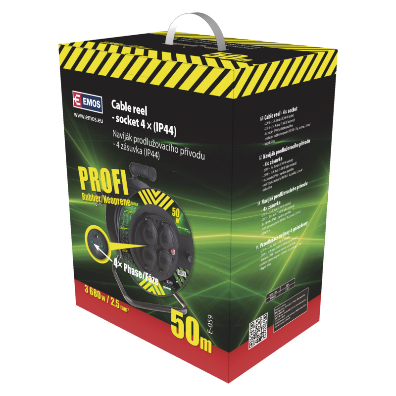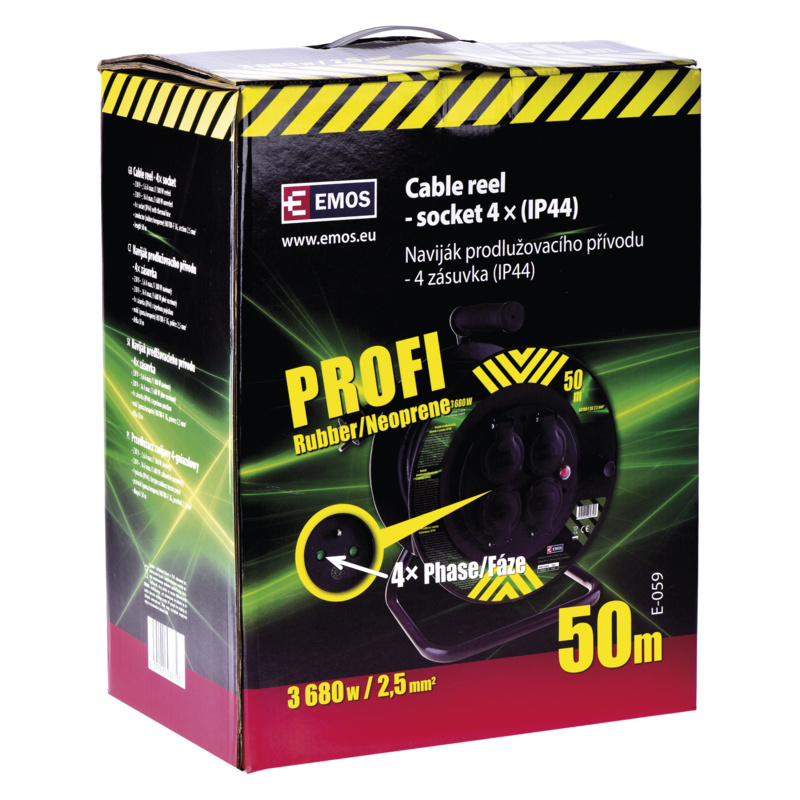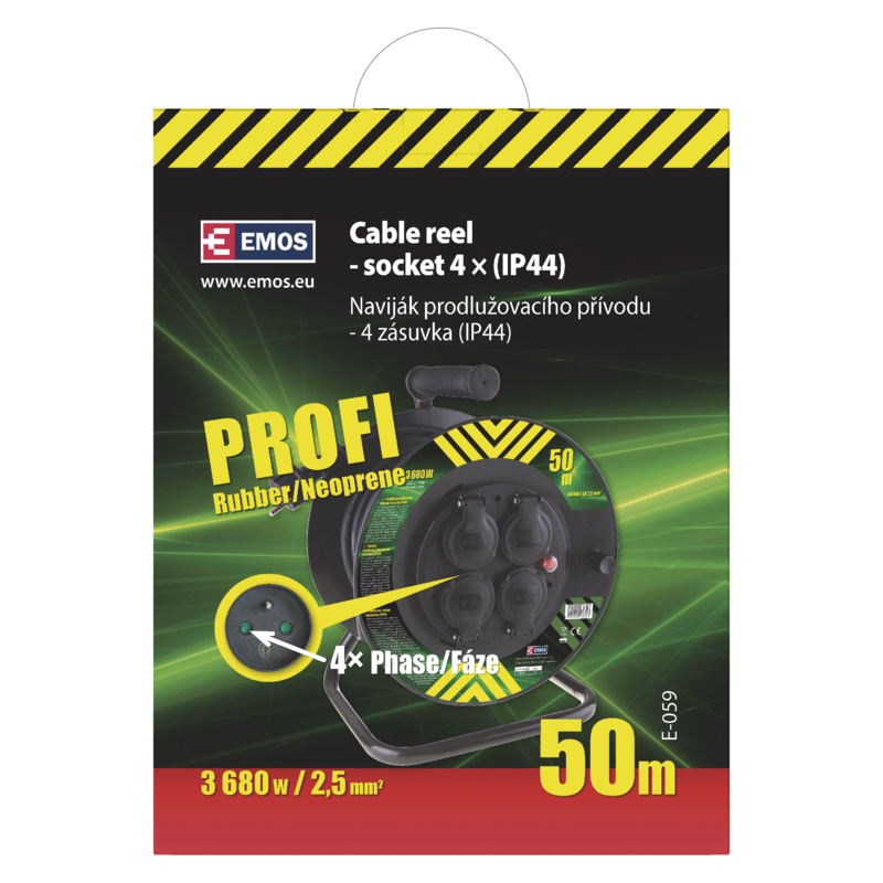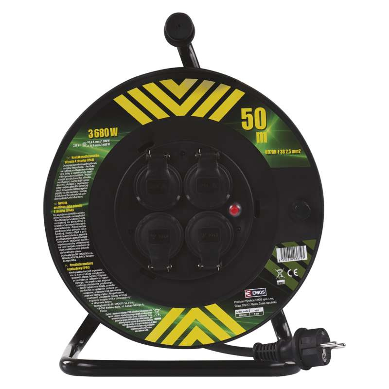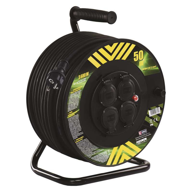 barva: neuvádí se|další funkce: ne|délka: 50 m|dětské clonky: ne|hmotnost: neuvádí se|krytí: IP44|max. zátěž: 3 680 W|napětí/proud: 230 V~|počet zásuvek: 4× 2P + PE|prodejní obal: 1 ks|produkt: buben s pohyblivým středem|průřez vodiče: 2,5 mm²|rozměr: neuvádí se|tepelná pojistka: ano|typ izolace: guma/neopren|vodič: H07RN-F|záruční doba: 2 roky|zatížení navinutého 230 V~: 5,6 A max./1 300 W|zatížení navinutého 400 V~: neuvádí se|zatížení rozvinutého 230 V~: 16 A max./3 680 W|zatížení rozvinutého 400 V~: neuvádí se