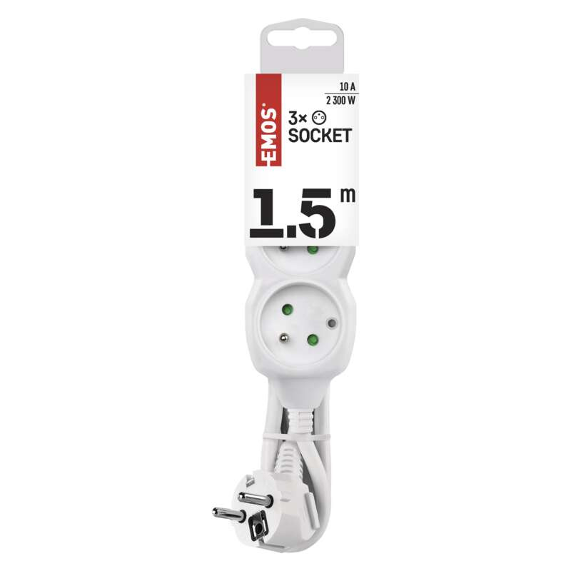 barva: bílá|délka: 1,5 m|dětské clonky: ano|materiál zásuvky a vidlice: plast|max. zátěž: 2 300 W|napětí/proud: 250 V~/10 A max.|počet zásuvek: 3× 2P + PE|prodejní obal: 1 ks, závěs|typ izolace: PVC|USB výstup: ne|vodič: H05VV-F3G 1 mm²|vypínač: ne