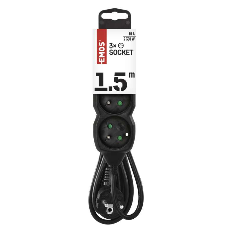 barva: černá|délka: 1,5 m|dětské clonky: ano|materiál zásuvky a vidlice: plast|max. zátěž: 2 300 W|napětí/proud: 250 V~/10 A max.|počet zásuvek: 3× 2P + PE|prodejní obal: 1 ks, závěs|typ izolace: PVC|USB výstup: ne|vodič: H05VV-F3G 1 mm²|vypínač: ne