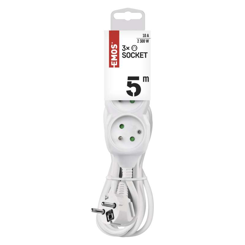 barva: bílá|délka: 5 m|dětské clonky: ano|materiál zásuvky a vidlice: plast|max. zátěž: 2 300 W|napětí/proud: 250 V~/10 A max.|počet zásuvek: 3× 2P + PE|prodejní obal: 1 ks, závěs|typ izolace: PVC|USB výstup: ne|vodič: H05VV-F3G 1 mm²|vypínač: ne