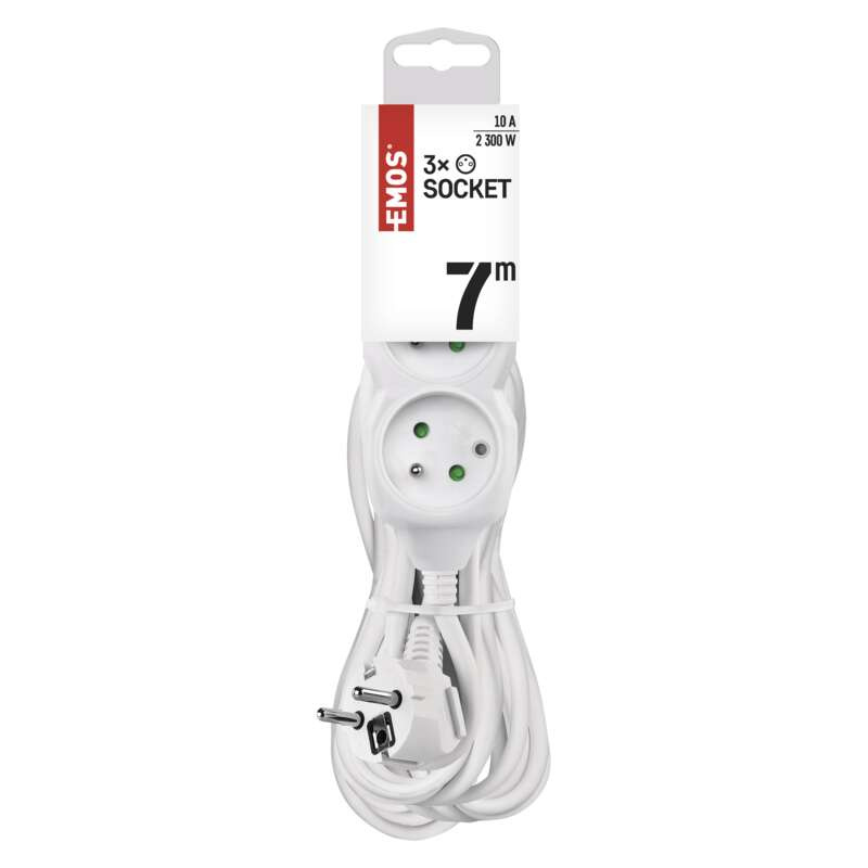 barva: bílá|délka: 7 m|dětské clonky: ano|materiál zásuvky a vidlice: plast|max. zátěž: 2 300 W|napětí/proud: 250 V~/10 A max.|počet zásuvek: 3× 2P + PE|prodejní obal: 1 ks, závěs|typ izolace: PVC|USB výstup: ne|vodič: H05VV-F3G 1 mm²|vypínač: ne