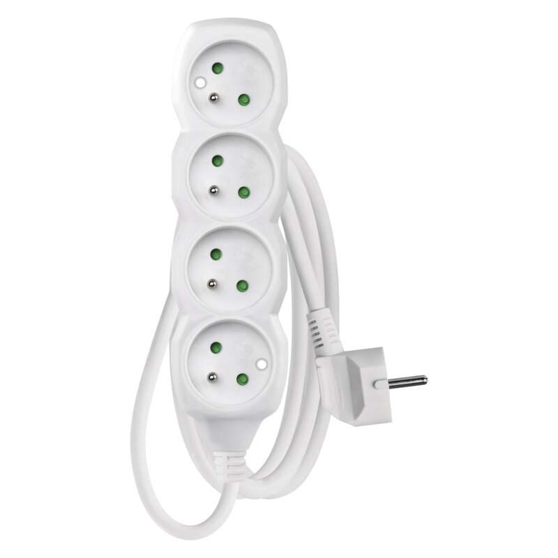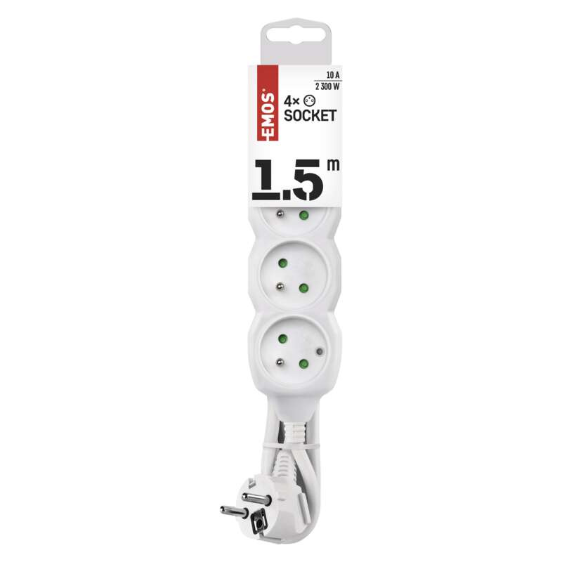 barva: bílá|délka: 1,5 m|dětské clonky: ano|materiál zásuvky a vidlice: plast|max. zátěž: 2 300 W|napětí/proud: 250 V~/10 A max.|počet zásuvek: 4× 2P + PE|prodejní obal: 1 ks, závěs|typ izolace: PVC|USB výstup: ne|vodič: H05VV-F3G 1 mm²|vypínač: ne