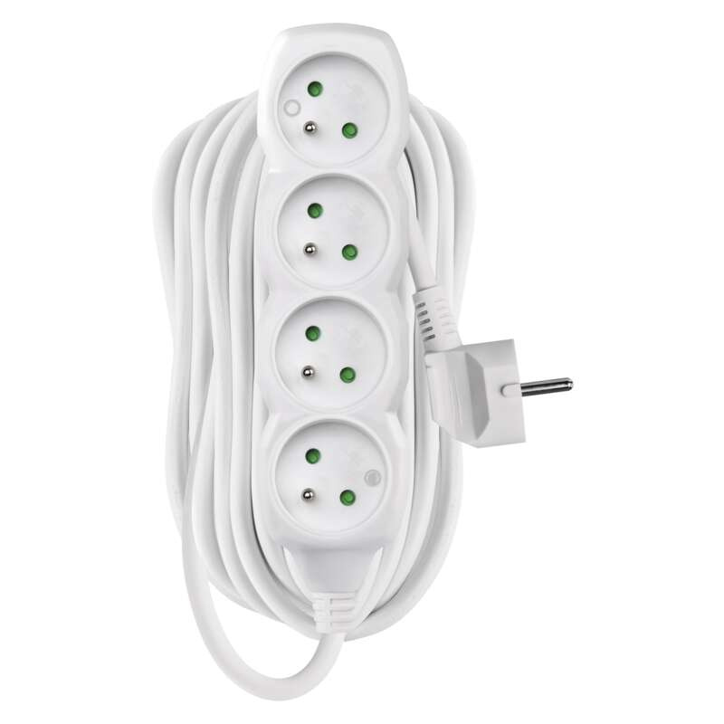 barva: bílá|délka: 10 m|dětské clonky: ano|materiál zásuvky a vidlice: plast|max. zátěž: 2 300 W|napětí/proud: 250 V~/10 A max.|počet zásuvek: 4× 2P + PE|prodejní obal: 1 ks, závěs|typ izolace: PVC|USB výstup: ne|vodič: H05VV-F3G 1 mm²|vypínač: ne