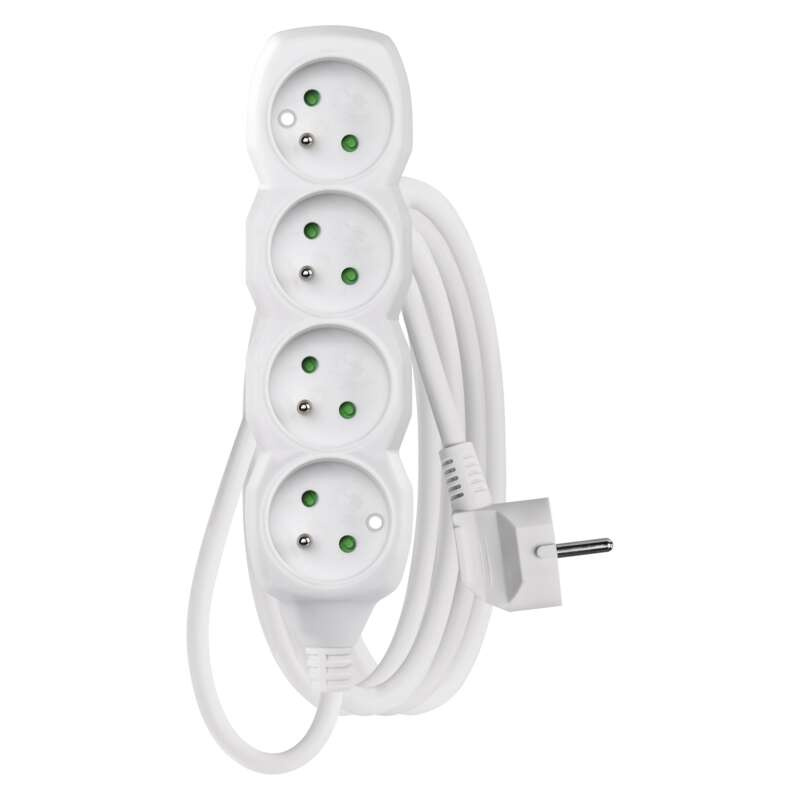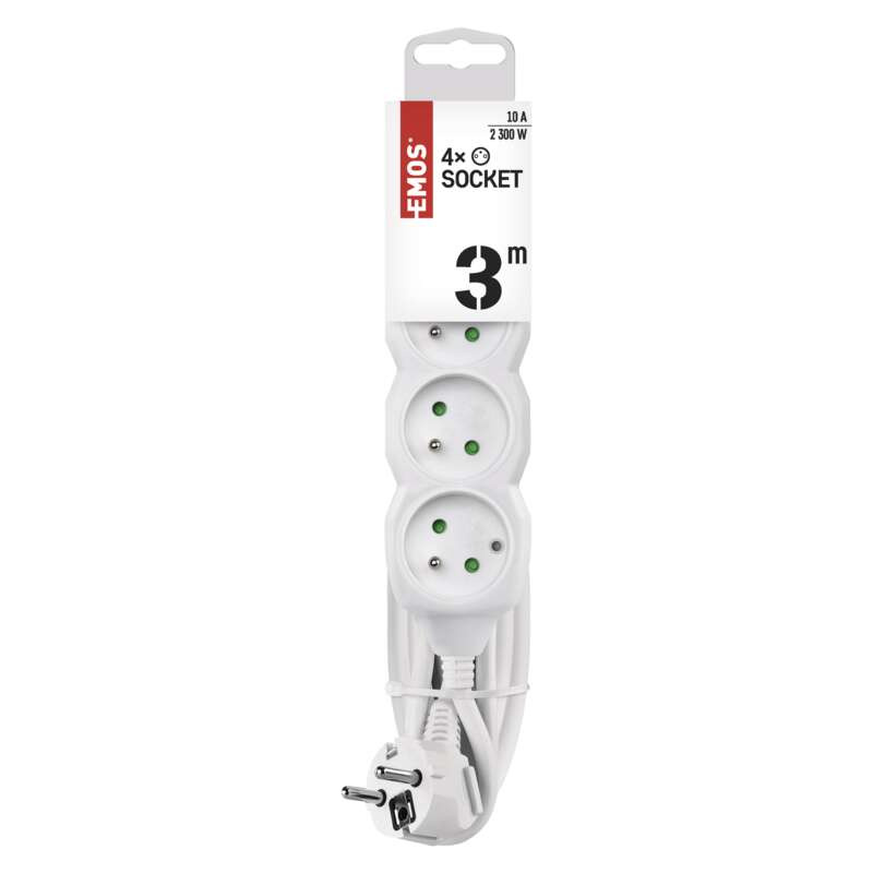 barva: bílá|délka: 3 m|dětské clonky: ano|materiál zásuvky a vidlice: plast|max. zátěž: 2 300 W|napětí/proud: 250 V~/10 A max.|počet zásuvek: 4× 2P + PE|prodejní obal: 1 ks, závěs|typ izolace: PVC|USB výstup: ne|vodič: H05VV-F3G 1 mm²|vypínač: ne
