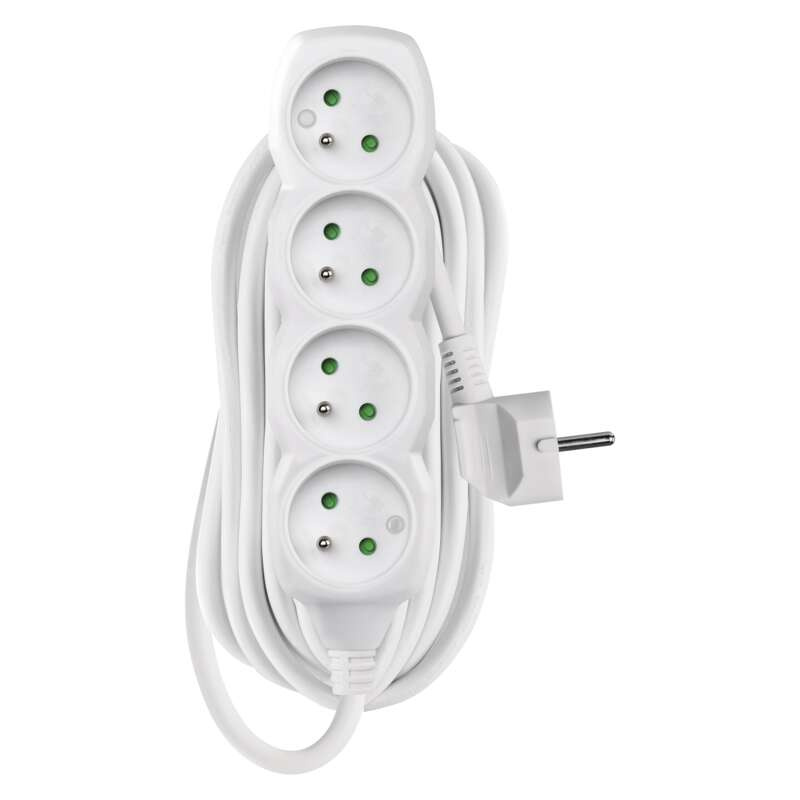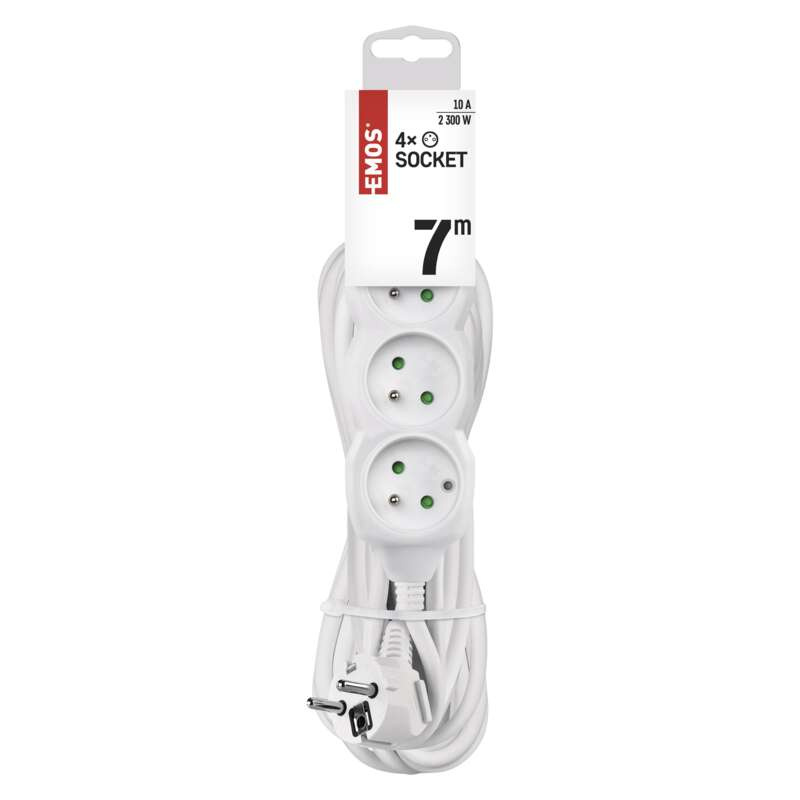 barva: bílá|délka: 7 m|dětské clonky: ano|materiál zásuvky a vidlice: plast|max. zátěž: 2 300 W|napětí/proud: 250 V~/10 A max.|počet zásuvek: 4× 2P + PE|prodejní obal: 1 ks, závěs|typ izolace: PVC|USB výstup: ne|vodič: H05VV-F3G 1 mm²|vypínač: ne