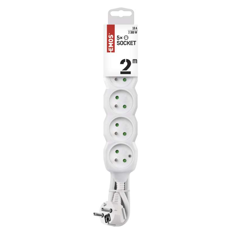 barva: bílá|délka: 2 m|dětské clonky: ano|materiál zásuvky a vidlice: plast|max. zátěž: 2 300 W|napětí/proud: 250 V~/10 A max.|počet zásuvek: 5× 2P + PE|prodejní obal: 1 ks, závěs|typ izolace: PVC|USB výstup: ne|vodič: H05VV-F3G 1 mm²|vypínač: ne