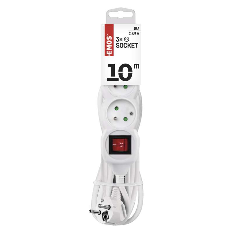 barva: bílá|délka: 10 m|dětské clonky: ano|materiál zásuvky a vidlice: plast|max. zátěž: 2 300 W|napětí/proud: 250 V~/10 A max.|počet zásuvek: 3× 2P + PE|prodejní obal: 1 ks, závěs|typ izolace: PVC|USB výstup: ne|vodič: H05VV-F3G 1 mm²|vypínač: ano