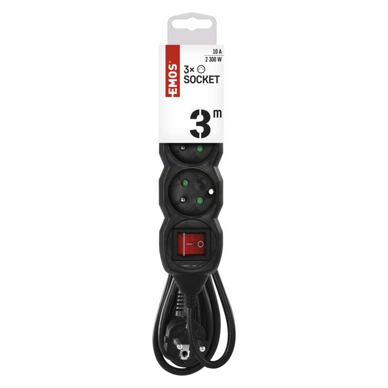 barva: černá|délka: 3 m|dětské clonky: ano|materiál zásuvky a vidlice: plast|max. zátěž: 2 300 W|napětí/proud: 250 V~/10 A max.|počet zásuvek: 3× 2P + PE|prodejní obal: 1 ks, závěs|typ izolace: PVC|USB výstup: ne|vodič: H05VV-F3G 1 mm²|vypínač: ano