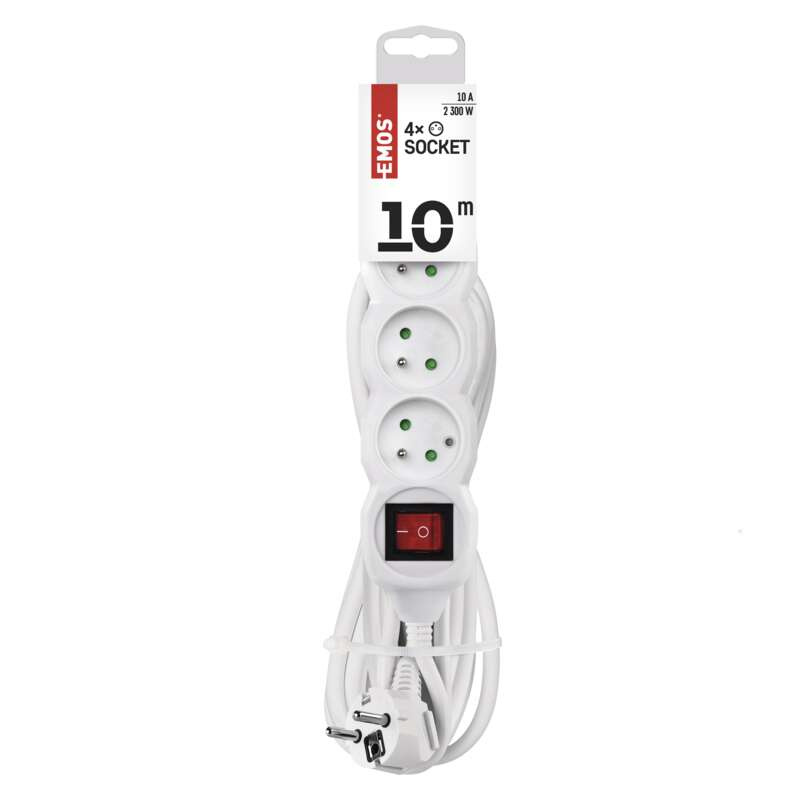 barva: bílá|délka: 10 m|dětské clonky: ano|materiál zásuvky a vidlice: plast|max. zátěž: 2 300 W|napětí/proud: 250 V~/10 A max.|počet zásuvek: 4× 2P + PE|prodejní obal: 1 ks, závěs|typ izolace: PVC|USB výstup: ne|vodič: H05VV-F3G 1 mm²|vypínač: ano