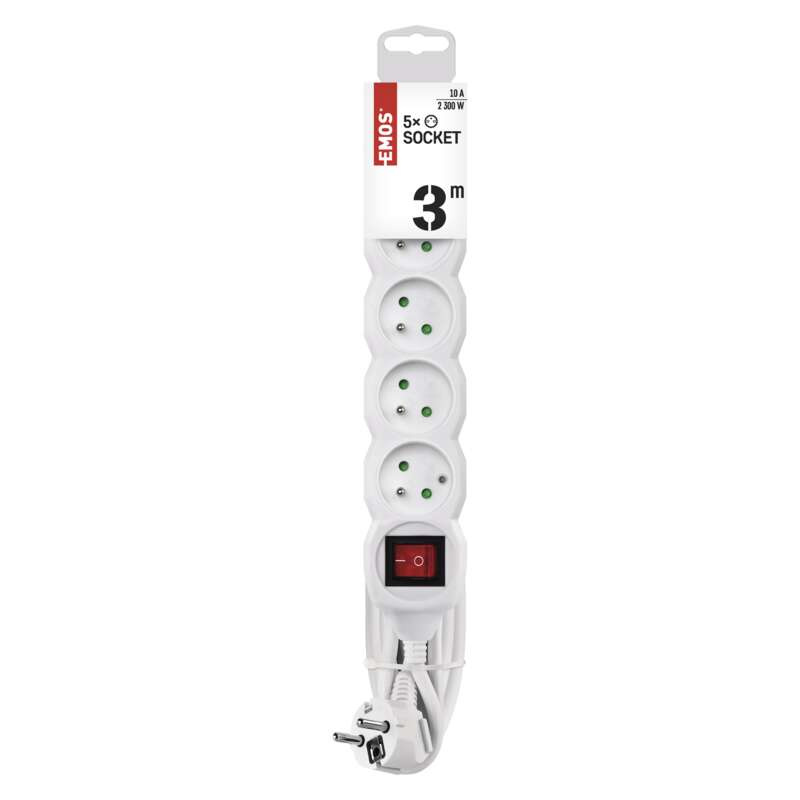 Bílý prodlužovací přívod, 5 zásuvka s vypínačem, délkou 3 m a průřezem vodiče 1 mm2. Vhodný pro maximální zátěž 10 A max.Prodlužovací přívod 3 m na 230 V~ slouží k prodloužení elektrické energie tam, kam pevná zásuvka nedosáhne.Při montáži na stěnu je nutné použít vrut se zápustnou hlavou PZ max. průměr 2,5–3 mm, délka 30–40 mm. V případě použití jiného průměru hrozí poškození plastové části otvoru. Pokud dojde k poškození plastové části otvoru, prodlužovací přívod nepoužívejte.Technické parametry