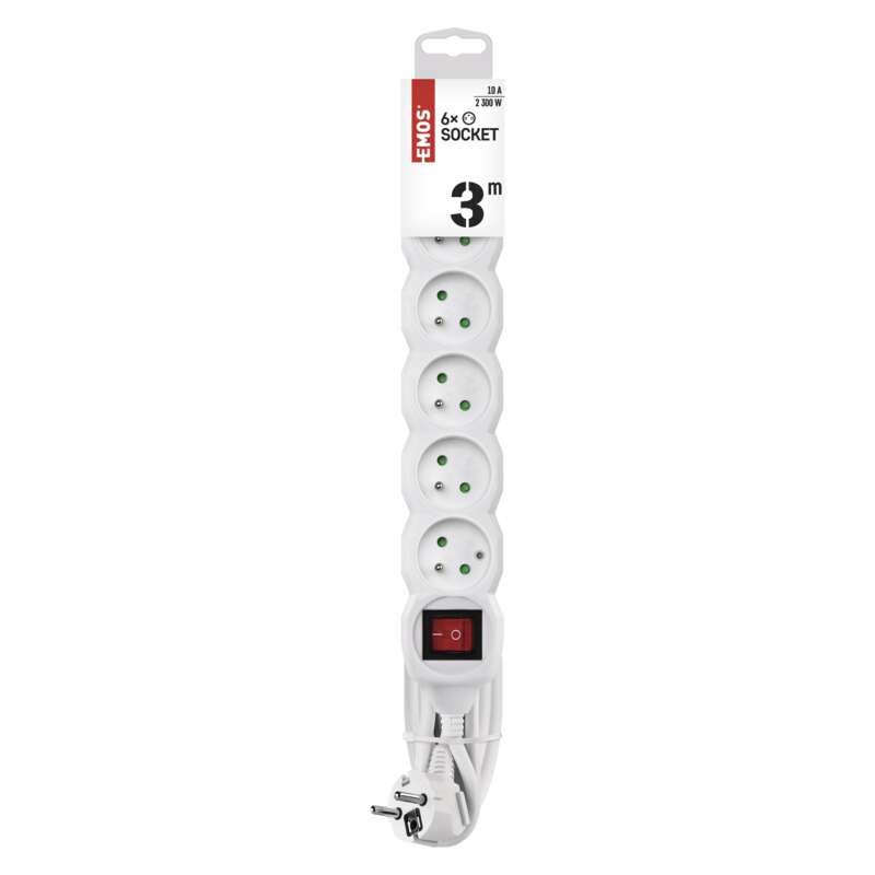 barva: bílá|délka: 3 m|dětské clonky: ano|materiál zásuvky a vidlice: plast|max. zátěž: 2 300 W|napětí/proud: 250 V~/10 A max.|počet zásuvek: 6× 2P + PE|prodejní obal: 1 ks, závěs|typ izolace: PVC|USB výstup: ne|vodič: H05VV-F3G 1 mm²|vypínač: ano