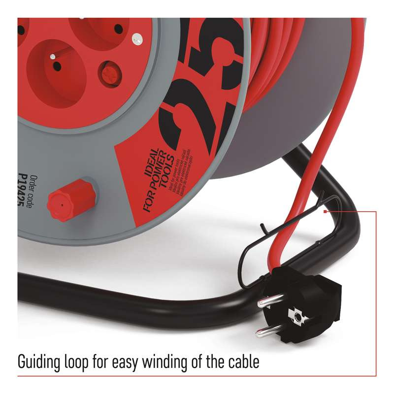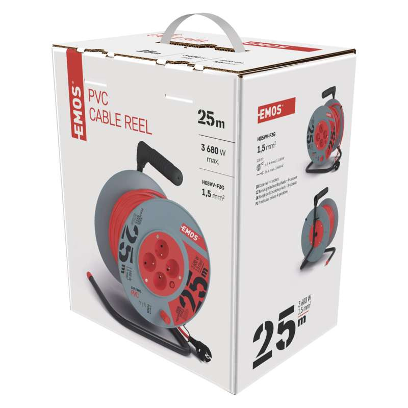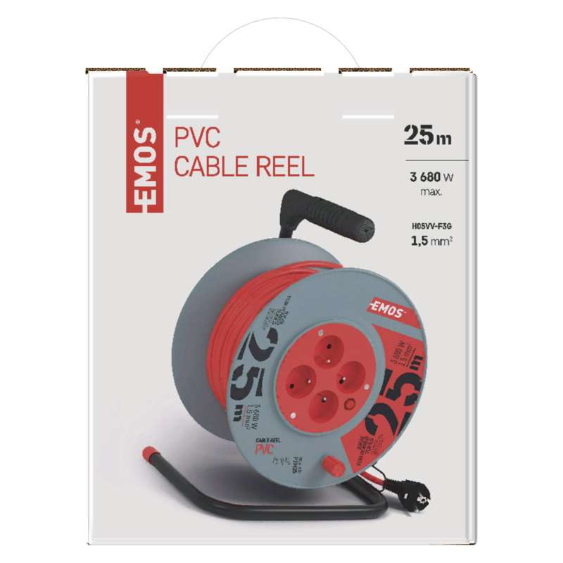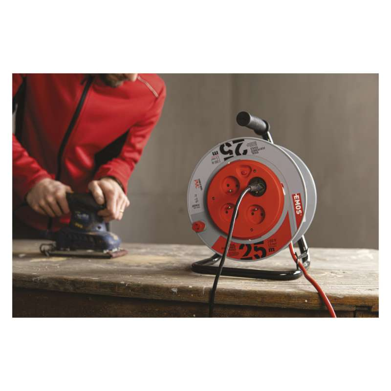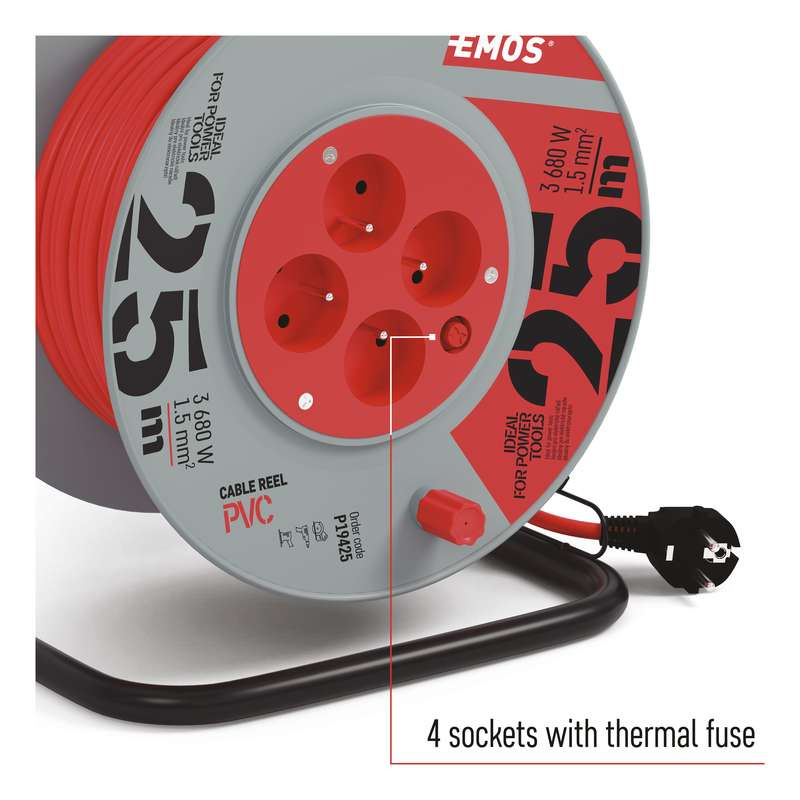 barva: neuvádí se|další funkce: ne|délka: 25 m|dětské clonky: ne|hmotnost: neuvádí se|krytí: IP20|max. zátěž: 3 680 W|napětí/proud: 230 V~|počet zásuvek: 4× 2P + PE|prodejní obal: 1 ks|produkt: buben s pohyblivým středem|průřez vodiče: 1,5 mm²|rozměr: neuvádí se|tepelná pojistka: ano|typ izolace: PVC|vodič: H05VV-F3G|záruční doba: 2 roky|zatížení navinutého 230 V~: 4,8 A max./1 100 W|zatížení navinutého 400 V~: neuvádí se|zatížení rozvinutého 230 V~: 16 A max./3 680 W|zatížení rozvinutého 400 V~: neuvádí se