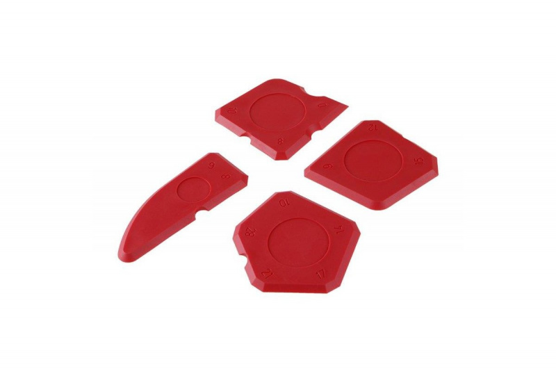 Stěrky na silikon, akryl a tmely jsou určeny pro čisté a hladké dokončení tmelení snadno se čistí z měkkého elastického materiálu na bázi silikonu nepoškozují hrany a nepoškrábou prosklené plochy v sadě čtyři špachtle v různých tloušťkách a profilechTechnické parametry