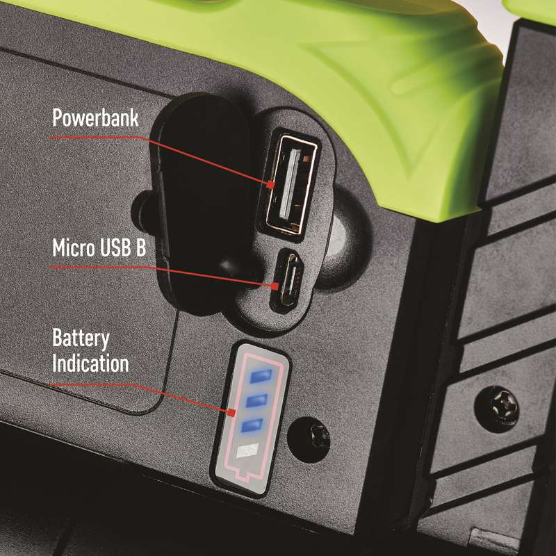 barva: černo-zelená|baterie součástí balení: ano|doba nabíjení: 7 h|doba svícení: 3,5–14,5 h|doba svícení detail: 2× COB LED 100 % – 3,5 h, 2× COB LED 50 % – 5,5 h, 1× COB LED 100 % – 5,5 h, 1× COB LED 50 % – 8,5 h, 1× COB LED 25 % – 14,5 h|dosvit: 2× COB LED 100 % – 70 m, 2× COB LED 50 % – 45 m, 1× COB LED 100 % – 45 m, 1× COB LED 50 % – 35 m, 1× COB LED 25 % – 25 m|fokus: ne|hmotnost: 818 g|LED indikace nabíjení: ano|LED indikace stavu akumulátoru: ano|materiál: ABS plast + guma|maximální dosvit: 70 m|maximální světelný tok: 2 000 lm|nabíjecí: ano|napájení: Li-Ion akupack|nárazuvzdornost: ano|počet režimů svícení: 5|příslušenství: USB kabel|prodejní obal: 1 ks, krabice|režimy svícení: 2× COB LED 100 %, 2× COB LED 50 %, 1× COB LED 100 %, 1× COB LED 50 %, 1× COB LED 25 %|rozměr: 214 × 140 (280) × 56 mm|speciální funkce: funkce rychlého vypnutí, funkce ochrany baterie|světelný tok: 2× COB LED 100 % – 2 000 lm, 2× COB LED 50 % – 1 000 lm, 1× COB LED 100 % – 1 000 lm, 1× COB LED 50 % – 500 lm, 1× COB LED 25 % – 250 lm|typ baterie: 8 000 mAh/3,7 V|typ napájecího konektoru: mikro USB B|voděodolnost: ne|vybavení: otočná rukojeť, 4× magnet|záruční doba: 2 roky|zdroj světla: 2× COB LED