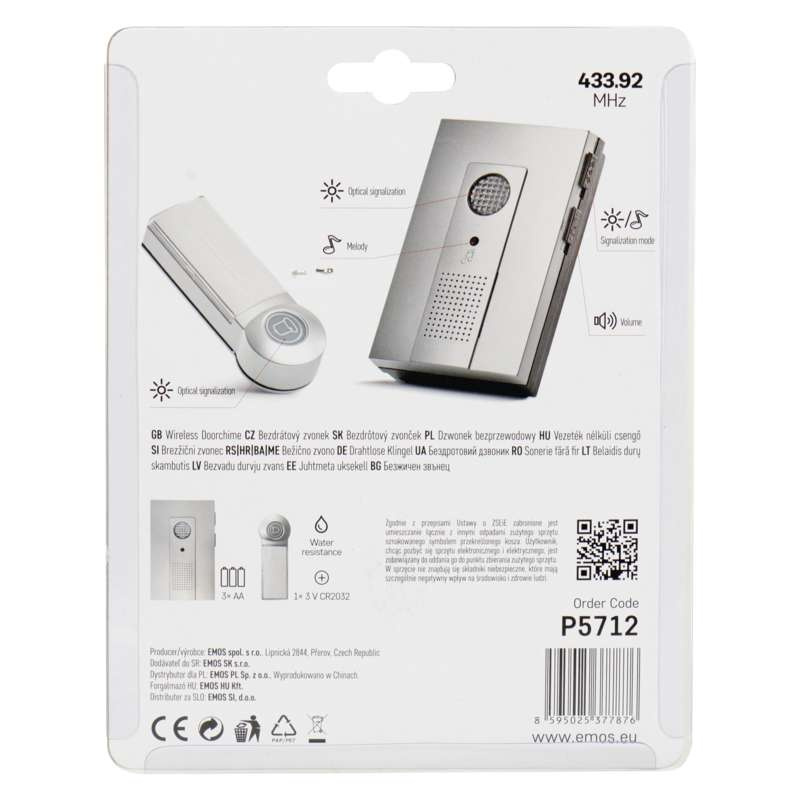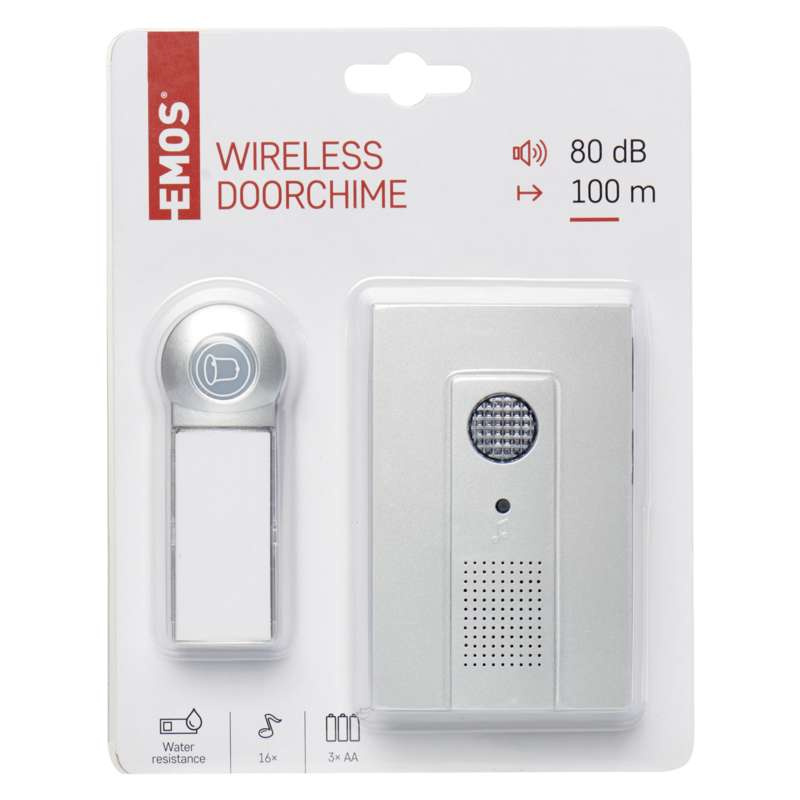 barva: stříbrná|dosah tlačítka: 100 m|maximální hlasitost zvonění: 80 dB|možnost přidat další tlačítko: ano, max. 8|napájení hlavní jednotky: 3× 1,5 V AA (nejsou součástí balení)|napájení tlačítka: 1× 3 V CR2032 (součástí balení)|optická signalizace na tlačítku: ano|optická signalizace na zvonku: ano|počet melodií: 16|počet přijímačů v balení: 1 ks|počet tlačítek v balení: 1 ks|přenosová frekvence: 433 MHz|přídavné (náhradní) tlačítko: P5723T|prodejní obal: 1 ks, blistr|regulace hlasitosti: ano|speciální funkce: ne|voděodolné tlačítko: ano|způsob párování: automatické párování – self-learning|způsob přenosu: bezdrátový zvonek