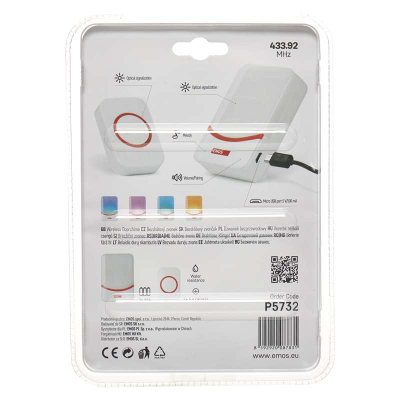 barva: bílá|dosah tlačítka: 100 m|maximální hlasitost zvonění: 90 dB|možnost přidat další tlačítko: ano, max. 16|napájení hlavní jednotky: 3× 1,5 V AAA (nejsou součástí balení) + micro USB 5 V|napájení tlačítka: 1× 3 V CR2032 (součástí balení)|optická signalizace na tlačítku: ano|optická signalizace na zvonku: ano|počet melodií: 38|počet přijímačů v balení: 1 ks|počet tlačítek v balení: 1 ks|přenosová frekvence: 433 MHz|přídavné (náhradní) tlačítko: P5732T|prodejní obal: 1 ks, blistr|regulace hlasitosti: ano, 4 úrovně|speciální funkce: výrazná optická signalizace zvonění|voděodolné tlačítko: ano|způsob párování: automatické párování – self-learning|způsob přenosu: bezdrátový zvonek